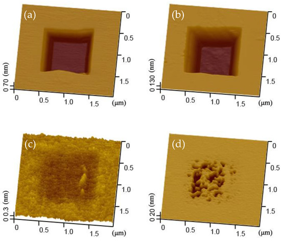 AFM images of wear scars on silicon surface after different etching time at 60%RH and 90%RH. Fn = 3 μN, N = 2, A = 1 μm × 1 μm, v = 4 μm/s, ωKOH = 10%. (a) Etching for 8 min after the wear test at 60% RH; (b) Etching for 16 min after the wear test at 60% RH; (c) Etching for 8 min after the wear test at 90% RH; (d) Etching for 16 min after the wear test at 90% RH.