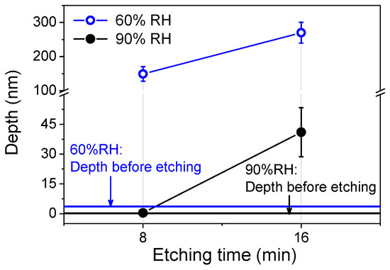 The depth of wear scars on silicon surface after different etching time between 60% RH and 90% RH. Fn = 3 μN, N = 2, A = 1 μm × 1 μm, v = 4 μm/s, ωKOH = 10%.