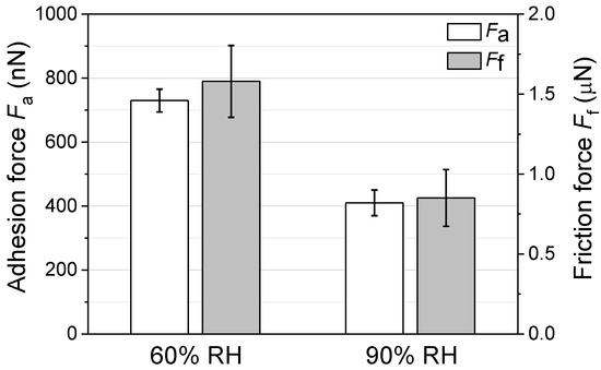 Adhesion force Fa and friction force Ff on silicon sample surface between 60% RH and 90% RH. Fn = 3 μN, N = 2, A = 1 μm × 1 μm, v = 4 μm/s.