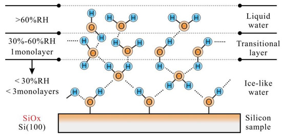 Based on the experimental results, the absorbed water will form different structures on the silicon sample surface (covered by SiOx) in varied humid conditions [36,37]. At RH < 30%, the ice-like water with less than 3 monolayers will form on the SiOx surface, see Figure 6. After that, the growth of the absorbed water is slow and less than one monolayer water forms on the surface of the ice-like water at 30–60% RH. With the further increase of RH value, the liquid water will generate on the previous water surface, as shown in Figure 6.