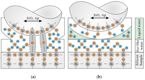 As a result, the surface of Si(100) substrate is terminated by the hydroxy, and the tribochemical Equation (4) can be maintained. Since the native oxide layer was removed by the Si-O-Si bridges at 60% RH, the dissipated energy Edis would not be lower than the required energy Ereq, see Section 4.1. However, the liquid water will form between the interfaces of Si/SiO2 pair at 90% RH. Due to the fluidity of the liquid water, the Si-O-Si bridges are hard to form between the interfaces of Si/SiO2 pair [28,36,38], as shown in Figure 7. For this reason, the shearing action (friction force) during the wear process has not to conquer the bond energy of Si-O-Si in the native oxide layer. Finally, the dissipated energy Edis is lower than the required energy Ereq and the wear of silicon sample was slight at 90% RH, see Section 4.1 and Figure 2.