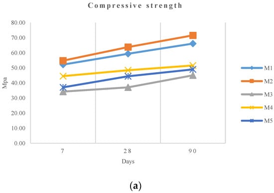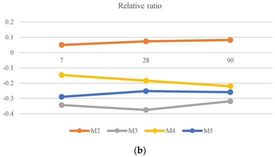 This experimental data shows how the M2 mixture provides a good compressive strength, even slightly above the reference sample, and 8% higher than that of M1. In Figure 5b, it can be observed how this relative compressive strength improvement is sustained over time. The other mixtures present certain strength loss, ranging from 32% for M3 to 22% for M4. This broad range—40% considering the four mixtures—proves that the origin, characteristics, and treatment given provide very different mechanical properties.