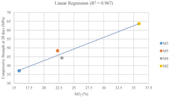 Regarding chemical composition, the proportion of SiO2 is the main factor to consider. Mix M4, with similar SiO2 content to the reference M1 (cement), shows the lower strength loss, and in the case of M2, where there is a strength gain, the SiO2 percentage is higher (Table 1). On the other hand, M2 and M5 with higher strength loss, have lower SiO2 content. In Figure 6, a linear regression is displayed showing the relationship between pozzolanic capacity and compressive strength. The correlation is strong with a R2 of 0.967.