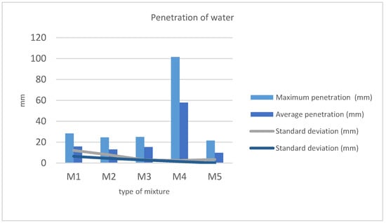 Excepting M4, all of the mixtures are in accordance with the norm EN 12390-8 []. The maximum deeper penetration is below the 30 mm limit established, and the average values do not exceed the 20 mm limit. M4 doubles both limits (Table 5). As seen in Section 4.1, it is the consequence of the appearance of internal cavities due to the very dry consistency of the concrete making a disperse aggregate mix, which cannot be eliminated by vibration. Water penetration is favored by this circumstance.