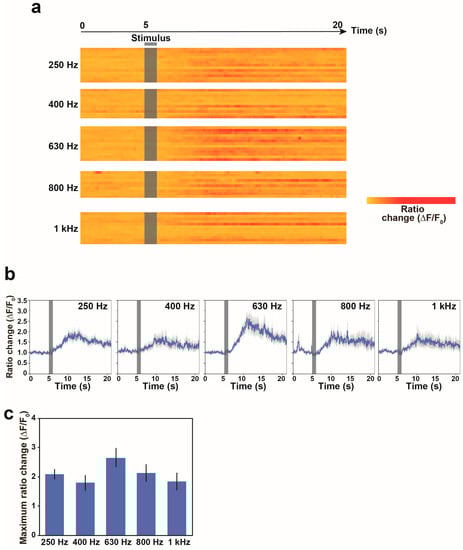 3.3. Calcium Responses of the AVA Neuron to Nonlocalized Vibration with Different Frequencies