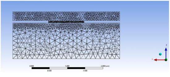 The commercial software of ANSYS Mechanical (ANSYS Inc, Canonsburg, PA, USA) has been chosen for simulating the lateral and the in-depth temperature profile of the quartz/Ag NW/ PEN interface by conducting a Finite Element Analysis. In Figure 1 the selected Grid is displayed. Grid sensitivity analysis was performed in order to determine the optimal grid in terms of accuracy and time efficiency for our case study: A coarse grid would produce inaccurate results, while a much denser grid approach would be computationally intensive. In our case, a well sized, refined and computationally efficient grid was created, with an average element size of 0.01 nm in the Ag-NW rod body of 50 nm in diameter (total number of elements comprising the rod is 3485). Therefore the aspect ratio of Ag NW diameter:element size is 5000:1. The mesh characteristics of the model are presented in Table 1: The Orthogonal Average Quality is an important measure of the mesh quality and varies from 0 to 1, with the latter being the best possible quality. In our case this value is approximately 0.87, indicating an adequate mesh quality for avoiding discretization errors. Two different geometries were simulated: 1: cylindrical—rod nanowires, 2: cuboid shaped nanowires.