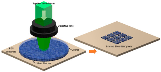 The Single Step Laser Transfer and Laser Curing Process. A top hat laser pulse is imaged at the interface of an Ag NW network coated on the bottom side of a quartz donor layer, donor and receiving substrates being in low vacuum contact.