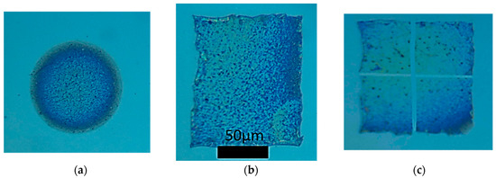 Optical microscope images of solid pixels transferred intact on PEN substrates, using single pulses of 20 mJ/cm2 and wavelength of 532 nm. (a) circular; (b) rectangular; (c) Square. An optical filter has been used to enhance contrast.