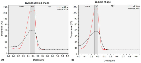 In-depth temperature distribution around the interface of quartz/Ag NW/PEN. Two different time moments are presented: The time corresponding to the maximal achieved temperature, immediately after the end of the effect of the pulse (10 ns), the time of the maximization of the heat affected zone in PEN (20 ns) an (a): cylindrical rod shape. At 10 ns the maximal achieved temperature at the interface (226.4 °C) goes down to below 100 °C at 50 nm in the interior of PEN. At 20 ns the heat affected zone is maximized at 100 nm depth. (b): cuboid parallelepiped shape. At 10 ns the maximal achieved temperature at the interface (241.5 °C) goes down to below 100 °C at 50 nm in the interior of PEN. At 20 ns the heat affected zone is maximized at 110 nm depth. Heat is also conducted to the interior of the quartz substrate, which is an indication that the presence of quartz contributes significantly to the heat dissipation.