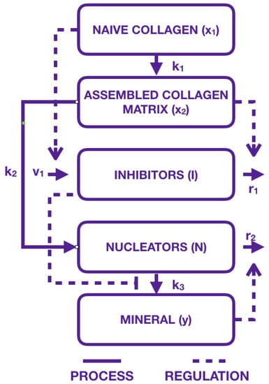 Thus, our new model consisting of Equations (4)–(9) is complete. This new model can be illustrated by a modified version of the scheme (Figure 1) by Figure 2. In this figure, collagen and mineral compartments are modified, whereas the influence of inhibitors and nucleators remain the same: