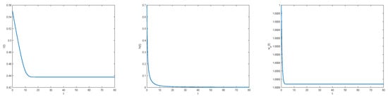 Evolution of (Left), (Middle), and (Right) with , , and .