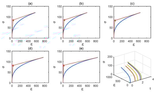 Parameters are , , and . The values of the parameter t are as follows: (a) ; (b) ; (c) ; (d) ; (e) .