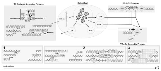 Regarding the TC-cAp self-assembly process during childhood and aging, one of the key steps is the enzymatic driven collagen assembly process where osteoblasts synthesize TC that bond two-by-two via divalent crosslinks (i.e., immature, HydroxyLysino-NorLeucine (HLNL) and DiHydroxyLysino-NorLeucine (DHLNL)). Some of the divalent crosslinks mature into trivalent CXL (i.e., mature, PYriDinoline (PYD) DeoxyPyriDinoline (DPD)) that bonds TC three by three. Then, the assembly of TC forms a collagen fibril where crosslinks provide cohesion and mechanical stability through covalent bonds [14,15,16]. In relation to the differences between adults and children regarding collagen crosslinking, child bones present a higher number of divalent crosslinks than adult bones [14,17]. Additionally, another key step of the TC-cAp self-assembly process is the mineralization process where complex chemical mechanisms enable control over crystal size, shape, orientation, phase, texture, and location. Briefly, cAp precipitates under the control of several NCPs that either nucleates or inhibits this process ( i.e., nucleators or inhibitors). Amongst all the NCPs, formation and growth of cAp are controlled by nucleators, inter alia, Bone SialoProtein (BSP) and inhibitors, inter alia, OsteoPontiN (OPN) and OsteoCalcin (OC) [18]. In relation to the differences between adults and children regarding mineralization, child bones present a higher number of small cAps than adult bones [19].