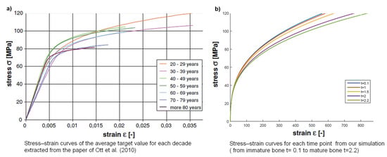 Regarding the mechanical properties, our model shows differences in bone mechanics based on the maturity (age) of the matrix that are similar to Ott et al. [26]. For instance, our results show that, in the case of an immature matrix and for the same modulus of elasticity (fixed here at 10 GPa), the ultimate strain (fixed at 120 MPa) is reached earlier in an immature case that in a mature case. This supports the data of Ott et al. [26], where the curves for the young decades reached a higher ultimate strain faster than the ones for the older decades (Figure 10). However, we did not include a criterion of rupture making it difficult to describe the mechanical behavior after this ultimate strain. Regarding the yield point (which describes the limits between elasticity and plasticity), we decided to use the same method as Ott et al. [26]. However, we have not been able to distinguish clear differences for the yield point between the conditions tested (Figure 7). This method is different from the one commonly used in experimental mechanics (offset method at 0.2%) making it difficult to clearly find the limit between elastic and plastic behavior in our data. Thus, further simulations are needed to be able to compare the two methods of calculation of the yield point, and to compare our results against our experimental data. Regarding the toughness, we consider toughness as the sum of elastic energy and plastic energy (i.e., ). Our results show an increase of toughness with age that is not supported by experimental data. This may come from the lack of criterion of rupture and our method of yield point assessment. Thus, we cannot draw conclusions on the toughness data obtained here.