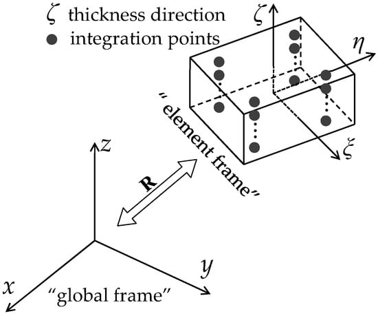 - Reese, S. A large deformation solid-shell concept based on reduced integration with hourglass stabilization. Int. J. Numer. Methods Eng. 2007, 69, 1671–1716. [Google Scholar] [CrossRef]