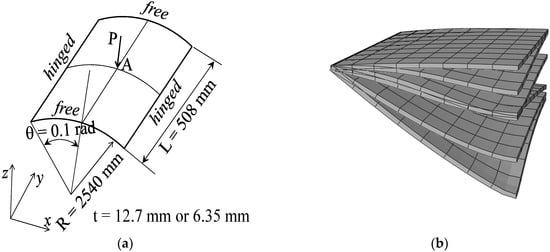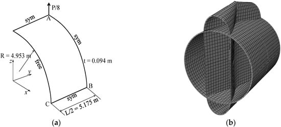 - Sze, K.Y.; Liu, X.H.; Lo, S.H. Popular benchmark problems for geometric nonlinear analysis of shells. Finite Elem. Anal. Des. 2004, 40, 1551–1569. [Google Scholar] [CrossRef]