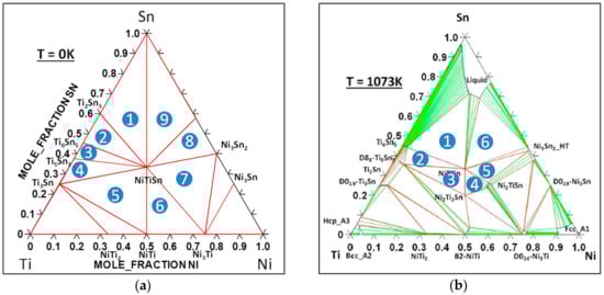 Isothermal phase diagram of the Ni-Sn-Ti system: (a) At 0 K, calculated in GGA; (b) at 1073 K plotted using the Calphad method [].