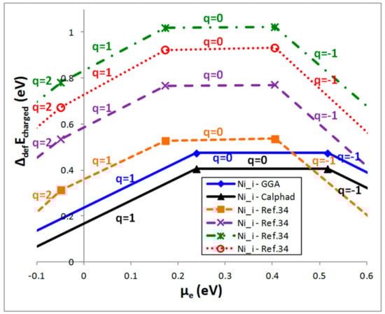 Evolution of ΔdefEcharged for Nii defects with the chemical potential of the electrons for different values of the charge q calculated for one defect in a 2 × 2 × 2 supercell taking into consideration the phase diagram calculated in GGA or assessed with the Calphad method.