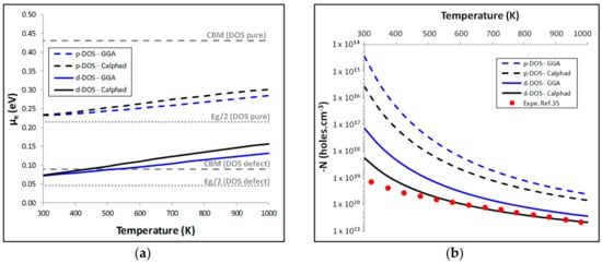 It becomes then obvious that the choice of the DOS will have an influence on the calculated carrier concentration N. As discussed in Section 3, the most accurate DOS is the one with the defect since it allows to give the best description of the experimental DOS and of its associated band gap. However, we have decided to do the calculation of N with the pure DOS (p-DOS) and with the DOS with the defect (d-DOS) to estimate the influence of this choice on N. The value of μe is then adjusted at each temperature to fulfill Equation (2) using the energy of formation of charged defects calculated using the GGA phase diagram or the one assessed by the Calphad method. The results (Figure 4a) show that at room temperature the chemical potential of the electrons is located between the mid-gap (Eg/2) and the conduction band maximum (CBM). As temperature increases, μe increases too and even crosses the CBM if the d-DOS is used to estimate μe. Such a behavior is typical of n-type semiconductors.