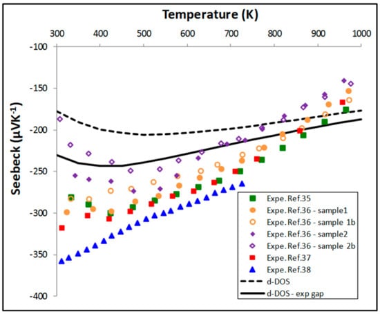 The Seebeck coefficient has been calculated by solving the Boltzmann’s equations using the BotzTraP code. For that, we have combined the previously calculated N with the band structure obtained from the cell with the defect (to be consistent with the method of determination of N). As stated in Section 3, the gap is slightly underestimated by the GGA for the Nii intrinsic defect. This can be corrected by a rigid band shift in the BoltzTraP code. We have adjusted the gap at 0.12 eV for all the temperatures. The obtained thermoelectric properties are compared with measurements [,,,] selected in our previous paper [].