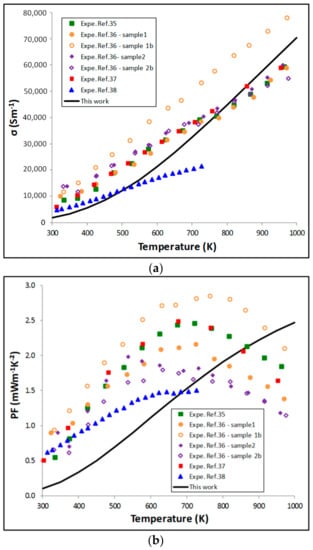 Concerning the electrical conductivity, in BoltzTraP, the constant relaxation time approximation is taken into consideration and σ/τ (where τ is the electronic relaxation time) is calculated. In this study, we have assumed that τ does not change with temperature. τ has been set at 6 × 10−15 s. In these conditions, there is approximately a good representation of the shape of the evolution of σ as a function of T (Figure 6a).