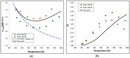 The BoltzTraP code also permits to calculate the electronic part of the thermal conductivity (κe) divided by τ. Using the previous value of τ, κe is estimated. This value is added to the lattice thermal conductivity (κl) to obtain the total thermal conductivity κ (κ = κe + κl). In this work, κl has not been re-calculated and the previous calculations of Hermet et al. [] have been taken into consideration. The thermal conductivity is highly impacted by grain boundaries and the grain size has to be taken into consideration in ab initio methods. In the work of Hermet et al. [], a mean grain size of 175 nm allows to reproduce the experimental values of κl at low temperature. These values (dashed lines) were added to our calculated κe and the resulting global thermal conductivity (Figure 7a) shows a good agreement with measurements [,].