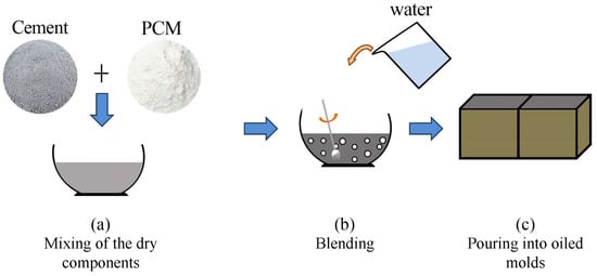Fifteen cubic samples were produced in total, i.e., five samples per mix design, with a dimension of 10 × 10 × 10 cm. The preparation of the five cement pastes was carried out by following the same procedure (Figure 1). First of all, the dry materials (cement and PCMs) were carefully manually merged in order to obtain an homogeneous powder mix. Consecutively, water was added to the compound, which was then carefully blended trying to preserve the capsules from brittle fractures due to the mechanical action. Finally, after reaching the required workability, the mixtures were poured into previously oiled molds and compacted in order to improve homogeneity and eliminate voids and air inclusions. Before the moulding of the samples, the workability was investigated through a modified Abram’s cone test. The comparable and acceptable results avoided the use of any types of fluidifying additives. Finally, the samples were cured within the controlled environment of an empty, fully monitored test building, which was kept at the temperature of 16 ± 0.5 C by using a built-in conditioning system during the whole curing process (28 days). After seven days, the specimens were unmolded within the same controlled environment where they were housed for the rest of the curing process.