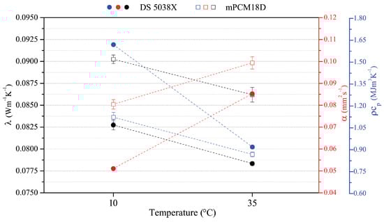 Thermal conductivity, thermal diffusivity and the volumetric specific heat of the DS 5038X and the mPCM18D microcapsules at 10 and 35 C.