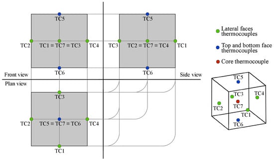 The thermal monitoring of the samples during the hydration process was carried out by using seven T-type thermocouples for each mix design. In more detail, six of these sensors were placed at the center of each samples’ face while the last one was introduced within the main core of the specimen. In this way, it was possible to accurately register the temperature gradients produced throughout the whole volume of the samples during the overall extent of the hydration process (Figure 3).