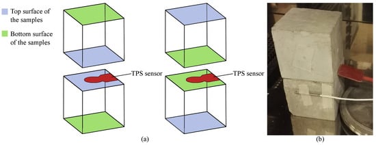 (a) schematic of the TPS (transient plane source) sensor and sample positioning; and (b) final experimental setup during the structural analyses using the Hot Disk 2500S.
