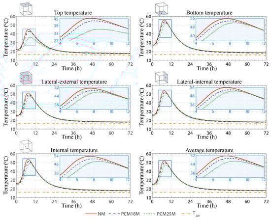 The same effect can also be seen when the temperature profile of the PCM25P paste is considered. However, in this case, the effect of the phase change also produces a time lag in the temperature trend. As it can be seen in Figure 7, the peak value of the monitored profile in this case is only reached after 8 h and 36 min, which is about 1 h later than the NP paste and 35 min later than the PCM18P paste.