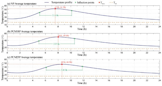 Average monitored temperature profiles for the first 24 h of the hydration process for (a) the NP; (b) the PCM18P and (c) the PCM25P sample, with the respective maximum and inflection points.