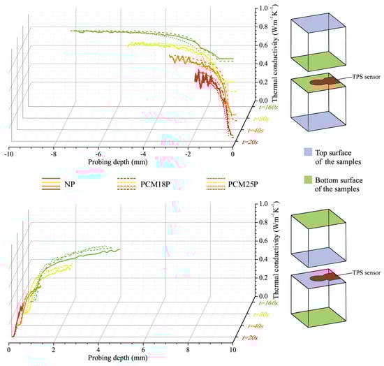 In general, the NP, PCM18P and PCM25P curves are similar; however, the bottom surface profiles show that (i) the NP sample produces the highest thermal noise; (ii) the PCM18P thermal conductivity trend is always the highest one; and (iii) the PCM25P always presents the lowest thermal conductivity. This is not true for profiles obtained by interposing the TPS sensor between the top surfaces of the cement cubes. In this case, as a matter of fact, the normal paste (NP) is always associated with the lowest thermal conductivity trend.