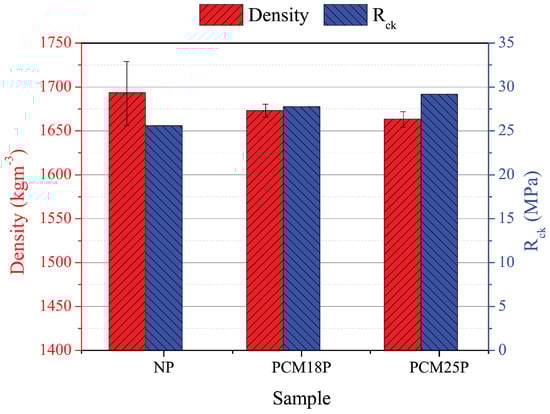 Average density and characteristic strength of the NP, PCM18P and PCM25P samples.