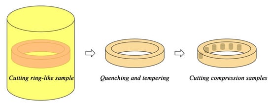 A Ti-38.89Al-9.62V ingot with a dimension of Φ90 × 420 mm was prepared by vacuum arc re-melting plus induction skull melting, and then hot isostatic pressed at 1250 °C/140 MPa for 4 h. A coaxial ring-like sample was cut from the ingot, as shown in Figure 1. Then the sample was annealed at 1350 °C (single β phase field) for 10 min and oil-quenched to induce the martensitic transformation. After that, the ring subjected to tempering at 1000 °C for 1 h to obtain a stable Q&T microstructure. A number of cylindrical samples with a dimension of Φ8 × 12 mm were machined from the ring for compression tests, with their axes parallel to that of the ring. By using the above processing method (see Figure 1), it ensures that all the compression samples have experienced the same thermo-cycles and hence have the same microstructure. The compression tests were performed on a Gleeble thermo-mechanical simulator (DSI, New York, NY, USA) at temperatures of 950 °C, 1000 °C and 1050 °C, and strain rates of 0.005 s−1, 0.05 s−1 and 0.5 s−1. After a height reduction of 60%, the compressed samples were water-quenched to room temperature.