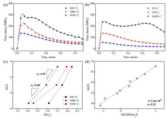 Flow curves at (a) 0.05 s−1 and (b) 1050 °C for the present alloy; (c) Variation of the stress exponent with stress; (d) Linear relationship between Zener–Hollomon parameter and peak stress.