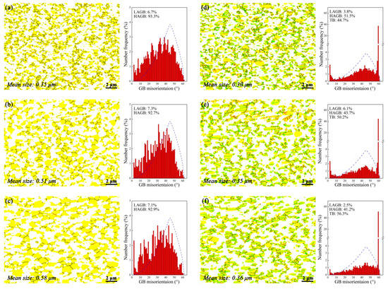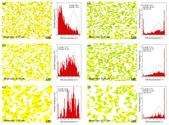 Figure 6 is the GB characteristics of the alloy after deformation at 0.05 s−1 under different temperatures. One can note that for the β matrix (Figure 6a–c), the LAGB is in a fairly low density at all temperatures, indicating an almost complete DRX. Meanwhile, the DRXed grain size is slightly increased with the increasing temperature. For the γ phase (Figure 6d–f), with the elevating temperature, the TB fraction is slightly increased accompanied by the slight decrease of the HAGB, whereas the LAGB remains a low number fraction. In conclusion, it is interesting to note that the deformation temperature plays an insignificant role in the microstructure evolution, in comparison to the strain rate.