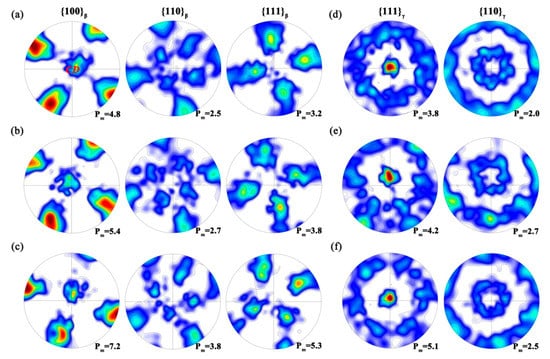 Pole figurs for (a–c) β and (d–f) γ phase at 1050 °C under (a,d) 0.5 s−1; (b,e) 0.05 s−1 and (c,f) 0.005 s−1. The maximum intensity is listed in the bottom-right for each pole figure.