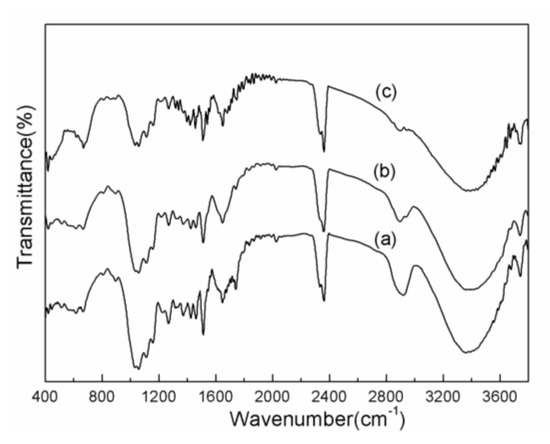 Fourier transform infrared spectroscopy (FTIR) spectra of the pretreated wood powder (a) wood powder without treatment; (b) wood powder pretreated by NaOH; (c) wood powder pretreated by 1.00 mol·L−1 FeCl3 and aqueous ammonia.