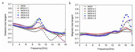 The calculated dielectric loss tangent (tgδe = ε″/ε′) and the magnetic loss tangent (tgδm = μ″/μ′) of α-Fe/Fe3C/woodceramic nanocomposites as a function of frequency are shown in Figure 6a and b, respectively. Comparing Figure 6a with Figure 6b, it can be seen both the dielectric loss tangent and the magnetic loss tangent fluctuate with the variation of frequency in the range of 2–18 GHz. The dielectric loss and magnetic loss are both lower than 1.0. The dielectric loss occupies the main position as the frequency is in the range of 2–12 GHz. The magnetic loss plays a dominant role as the frequency is in the range of 14–18 GHz. It can be observed magnetic loss tangent of WCM is close to 0, which indicates woodceramic has no magnetic loss. As the increasing of concentration of FeCl3 from 0.1 mol·L−1 to 1.0 mol·L−1, both the dielectric loss and magnetic loss improve.