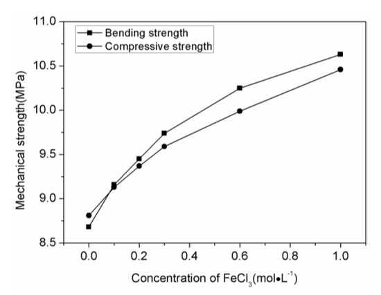 The compressive strength of the samples was tested by universal mechanical testing machine (WDW-10, Jinan Xinshijin Testing Machine Co., Ltd., Jinan, China). The crosshead speed was 5 mm·min−1. The dimensions of the samples were about 20 mm × 10 mm × 4 mm. Five samples were tested to obtain an average value.