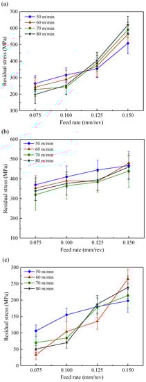 As shown in Figure 4, the surface residual stress along the three directions (axial direction, circumferential direction and intermediate direction) increased significantly with the feed rate changing from 0.075 mm/rev to 0.15 mm/rev. This was in agreement with Sharman et al. [29] who found that a higher feed rate resulted in increased tensile residual stress of the machined surface when turning Inconel 718 with various feed rates. Madariaga et al. [14] suggested that the surface residual stress was similar in the cutting direction for all the analyzed cases but it increased in the feed direction when increasing the cutting speed or feed rate. However, in the present work the cutting speed appeared to have no influence on surface residual stress along circumferential direction as shown in Figure 4b. The tendency towards more tensile residual stress can be related to an increase of plastic deformation as the feed rate increased.