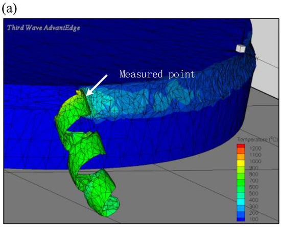 Three-dimensional finite element model (a) and cutting temperatures at different feed rates for the fixed cutting speed of 80 m/min (b).