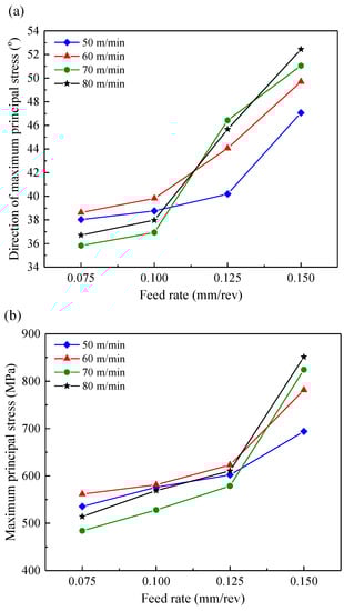 The direction and magnitude of the maximum principal residual stress under all the cutting conditions in this research are summarized in Figure 8. Figure 8a shown that the maximum principal residual stress was located within the range of 36.4°~52.4° from the circumferential direction (the direction of the minimum principal residual stress was perpendicular to the maximum principal residual stress). The angle between the maximum principal residual stress and the circumferential direction was defined as the direction of maximum principal residual stress. It can be observed from Figure 8a that the maximum principal residual stress angle increased rapidly as the feed rate increased. It indicated that the direction of maximum principal stress tended to approach the axial direction with the increase of feed rates. This could be explained by the more increased surface residual stress along the axial direction than that along the circumferential direction. As shown in Figure 8b, the magnitude of the maximum principal residual stress increased significantly with the feed rate changing from 0.075 mm/rev to 0.15 mm/rev. This can be attributed to the increased surface residual stress along the axial direction and circumferential direction as explained in the previous section of this paper.