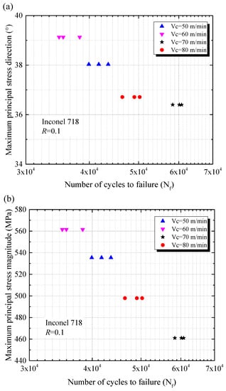 where Δσ is the stress range, σ′f is the fatigue strength coefficient. σm is the mean stress and b is the fatigue strength exponent. The maximum principal residual stress was tensile stress; however, the higher mean stress σm was induced by the increased maximum principal residual stress. This could result in the fatigue life declining, according to Equation (16). Conversely, if the maximum principal residual stress is a compressive one, the raised maximum principal residual stress would lower the effect of the mean stress. The fatigue life thus can be prolonged during service. The direction and magnitude of maximum principal residual stress play a key role on the fatigue life. The maximum principal residual stress on the surface can be more suitable for indicating the effect of residual stress on fatigue performance of machined components.