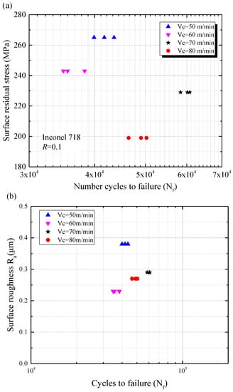 Axial tension-tension fatigue tests were carried out to investigate the relationship between the maximum principal residual stress and the fatigue performance of machined specimens. Depending on the same loading condition, the fatigue performances at different levels of the maximum principal residual stress were shown in Figure 9. Fatigue test results show that the total fatigue life of the specimen was strongly dependent on the direction of the maximum principal residual stress. The highest and the lowest fatigue life occurred at the direction of the maximum principal residual stress were 36.4° and 39.1°, respectively (see Figure 9a). As the direction of the maximum principal residual stress increased from 36.4° to 39.1° (increased by 7.4%), the fatigue life decreased from 59,765 cycles to 36,236 cycles (decreased by 39.4%). It can be observed from Figure 9b that the magnitude of maximum principal residual stress affected significantly the fatigue life of the specimens. The highest and the lowest magnitude of the maximum principal residual stress were 561.5 MPa and 461.0 MPa, which corresponded to the lowest and the highest fatigue life of the specimens were 59,765 cycles and 36,236 cycles, respectively. It was noted that the maximum principal residual stress magnitude diminished by 17.9%, and the fatigue life increased by 83.6%. Figure 10a illustrates the relationship between fatigue life and surface residual stress along the axial direction. Figure 10b shows the relationship between fatigue life and surface roughness. However, there was no significant influence of surface roughness Ra on the fatigue life under the conditions used in our research (see Figure 10b). This was consistent with the research of Moussaoui et al. [22,23]. The results shown that the fatigue life had almost no change with the increase of surface roughness and the surface residual stress along the axial direction. The fatigue tests demonstrated that the surface residual stress did not influence the fatigue life directly. It can be considered that the surface residual stress was not a suitable indicator to show the influence of residual stress on fatigue performance. The maximum principal residual stress may be the dominant factor affecting fatigue life of machined components.