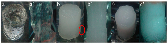 Morphological contrast between original samples and compressed samples (compression strain 99%); (a) N, (a’) compressed N; (b) O, (b’) compressed O; (c) P, (c’) compressed P.
