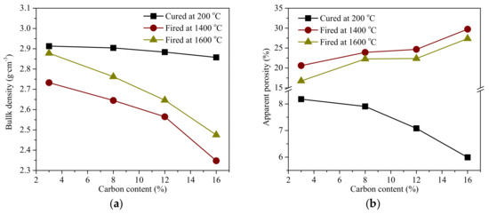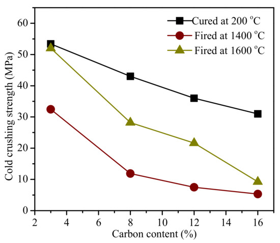 - The bulk density, apparent porosity, and cold crushing strength of the cured MgO-C refractory decreased as the carbon content increased. These properties degraded after firing, especially at higher carbon content.