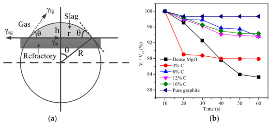 - The molten slag penetration into the MgO-C refractory, which decreased the apparent volume during the wetting process. The penetration extent was closely related to the contact angle between the MgO-C refractory and the molten slag.