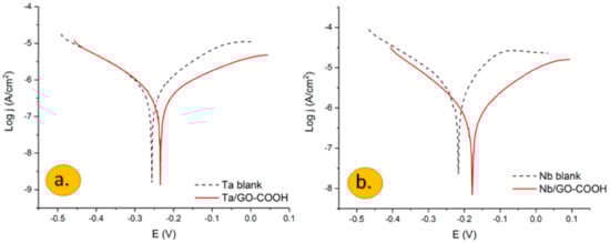 Polarization plots obtained for the Nb and Ta electrodes in a 0.1 M H2SO4 aqueous solution in the presence and the absence of carboxylated graphene oxide are shown in Figure 1a,b.